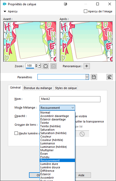 le calque (Mask2) > Propriétés et mettre le Mode Mélange sur Recouvrement.